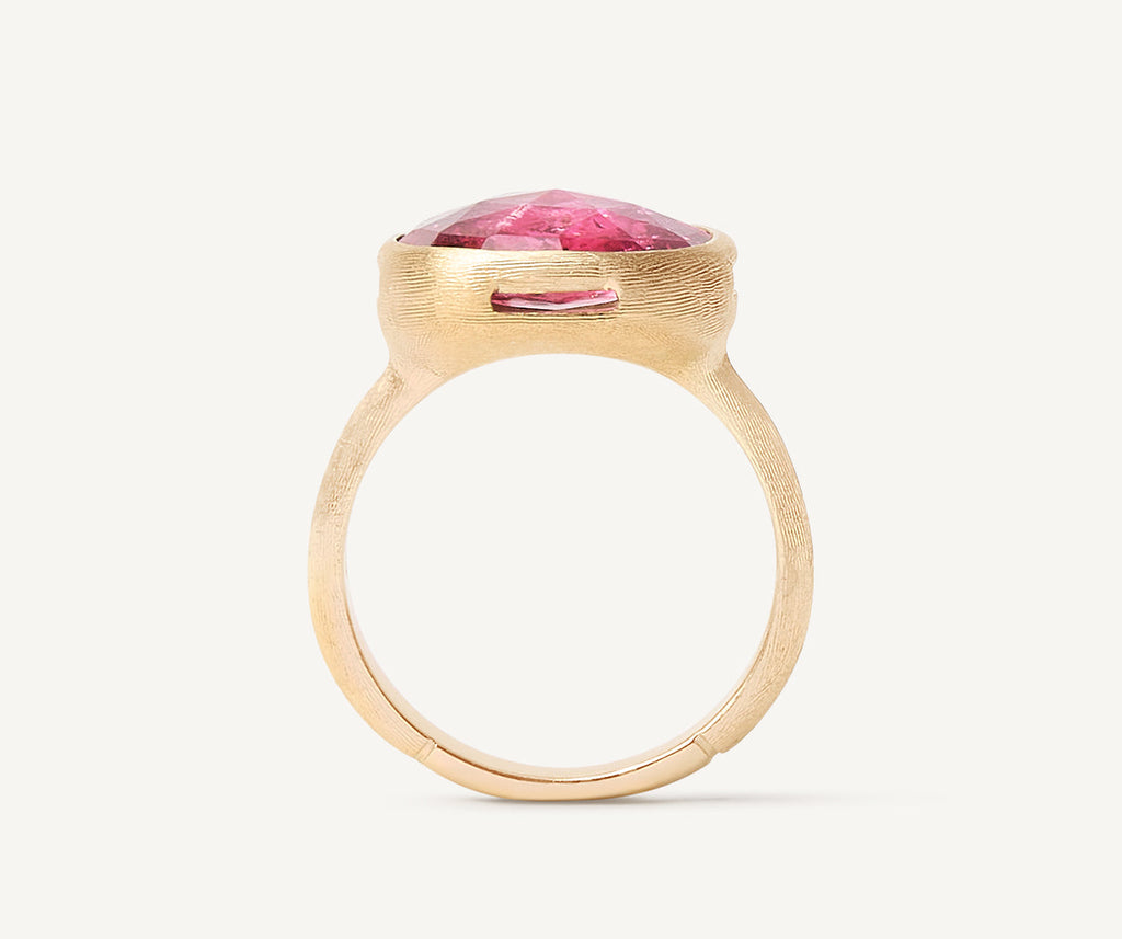 This elegant 18ky yellow gold ring is finely hand-engraved using an ancient Florentine technique. The Pink Tourmaline, with its exclusive cut, is enhanced by a lateral slit, which allows the light to enter and facilitates the ring’s maintenance.