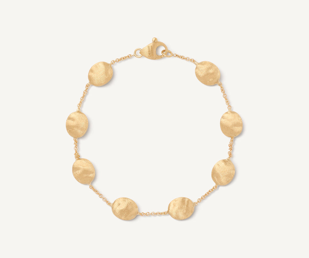 Elegant and timeless, this bracelet alternates a slender chain with oval elements in 18kt yellow gold with an irregular surface, finely hand-engraved using an ancient Florentine technique.