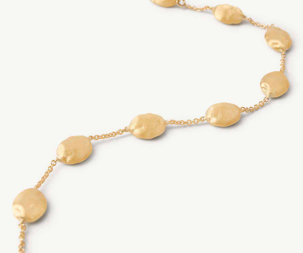 The SIVIGLIA collection is a tribute to Andalusian culture and is inspired by the nuances and traditions of the magical city of Seville. Thin 18-carat yellow gold chains are interspersed with small baroque oval shapes, hand-engraved and occasionally embellished with pavé diamonds. The design is simple and delicate, yet it is rendered special by the irregular and purposely imperfect shapes and the velvety reflections of the hand-engraved yellow gold, creating an infinite interplay of light and tone.