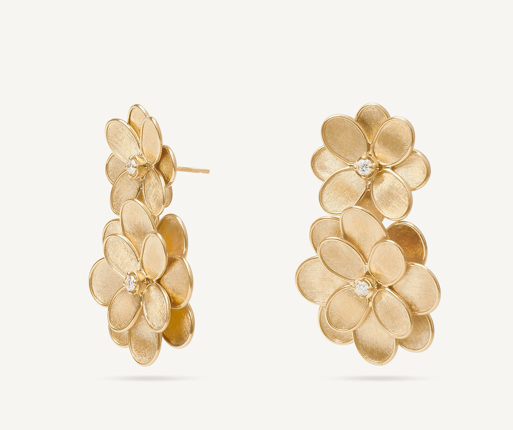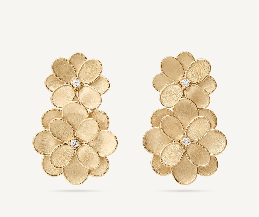 The perfect earrings to embellish the most elegant looks and more: elegant flowers in 18kt yellow gold, finely hand-engraved using the ancient Florentine technique, are embellished with brilliant-cut diamond bezels.