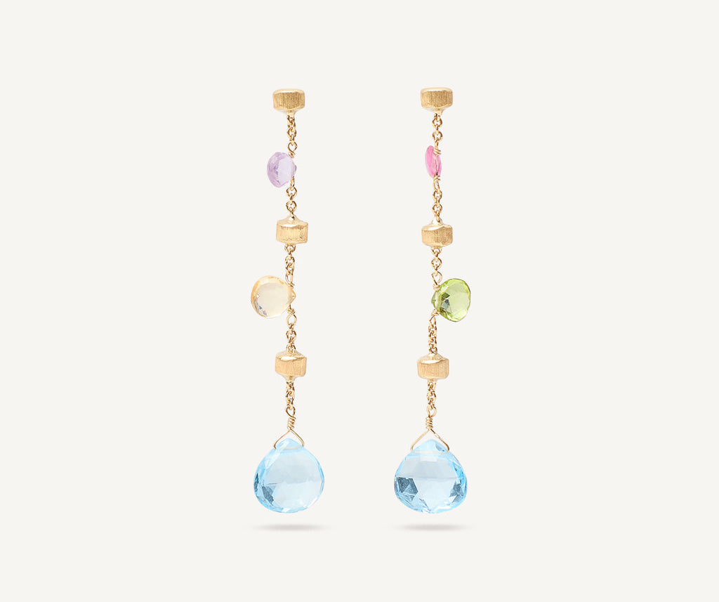 Elegant and bold, this earring mounts a selection of multicoloured heart-cut gemstones, interspersed with precious 18kt yellow gold nuggets, hand-engraved using an ancient Florentine technique.