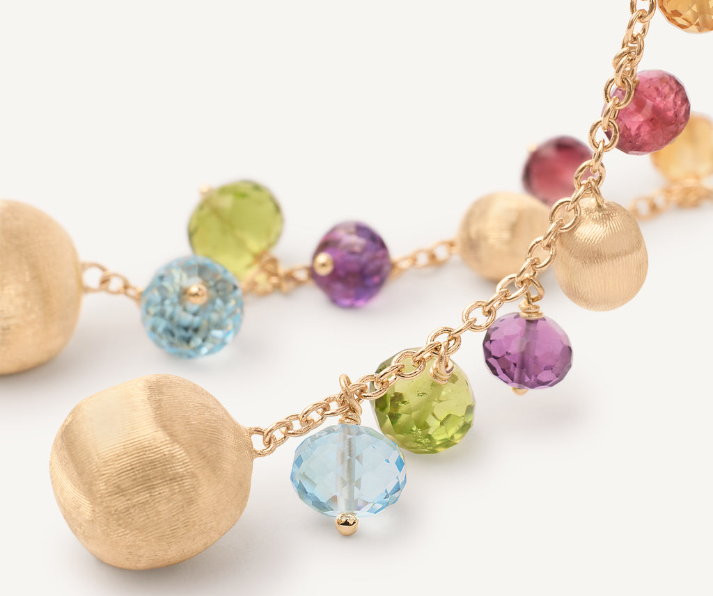 18kt yellow gold duster earrings, with hand-engraved gold beads separated by graduated gemstone accents. The beads are finely hand-engraved using the ancient Florentine technique, which gives our gold a fine, brushed texture. A statement earring to add a pop of colour to any outfit.