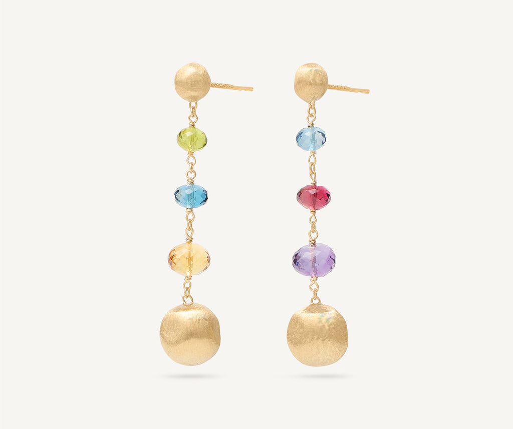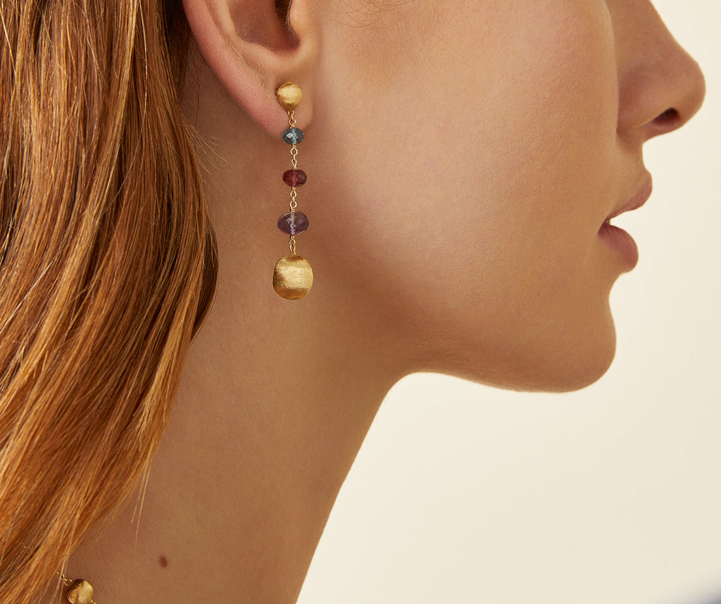 18kt yellow gold duster earrings, with hand-engraved gold beads separated by graduated gemstone accents. The beads are finely hand-engraved using an ancient Florentine technique, which gives our gold a fine, brushed texture.