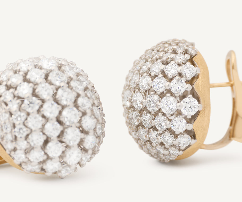 Elegant and versatile, these 18K yellow gold drop earrings feature hand-engraved studs paired with sparkling diamond pavé boules. The contrast of hand-engraved gold and radiant diamonds creates a balance of texture and light. Distinctive and graceful, they elevate any look.