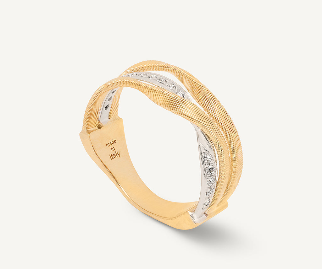 The refined design of this 18kt yellow gold ring makes it a precious accessory to wear every day. Two strands of twisted coil alternate with a brilliant-cut diamond pavé band, creating a mesmerizing combination of textures and colors.