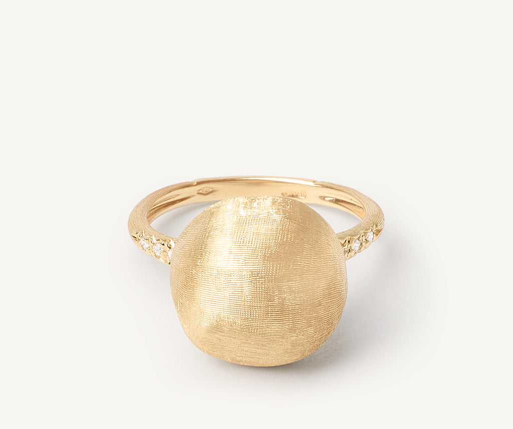 Dieser Ring aus Gelbgold mit 18 Karat mit unregelmäßiger Oberfläche, die in einer antiken Technik mit dem Fadenstichel von Hand graviert ist, um eine zarte, unregelmäßige Satinierung zu erzielen, hat zusätzlich einen zarten Besatz aus Diamanten in Brillantschliff. Ein zeitloser Klassiker.