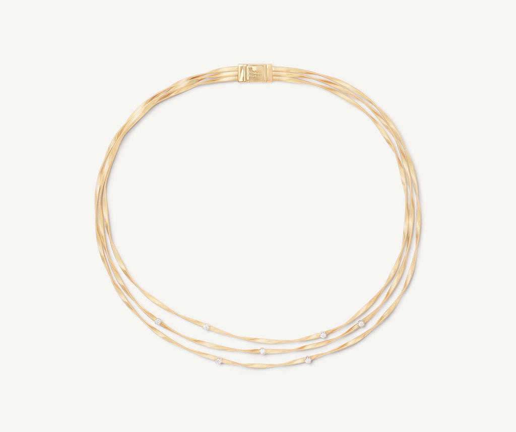 Diese wunderschöne Halskette mit drei Reihen gedrehter Spirale aus Gelbgold in 18 Karat ist mit der exklusiven handwerklichen Coil-Technik gefertigt und mit sieben Diamanten in Brillantschliff geschmückt. Eine einzigartige Stilerklärung.
