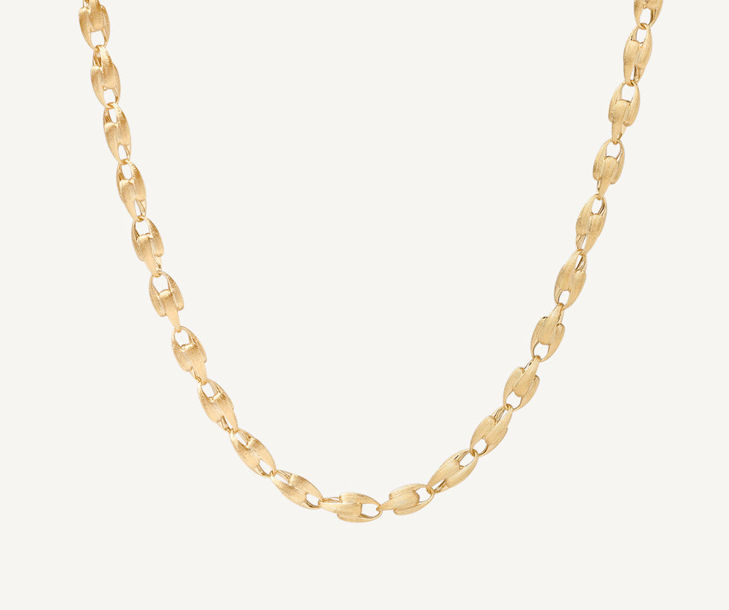 Diese wunderschöne Halskette aus Gelbgold mit 18 Karat besteht aus Elementen, die in einer unendlichen Umarmung miteinander verbunden sind. Die Satinierung ist in einer antiken Technik mit dem Fadenstichel von Hand graviert. Dieses Schmuckstück ist ein absolutes Must-have für jeden Tag.