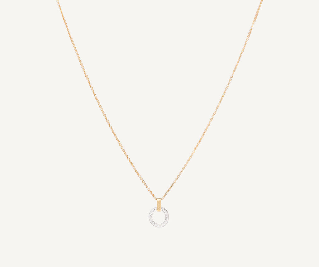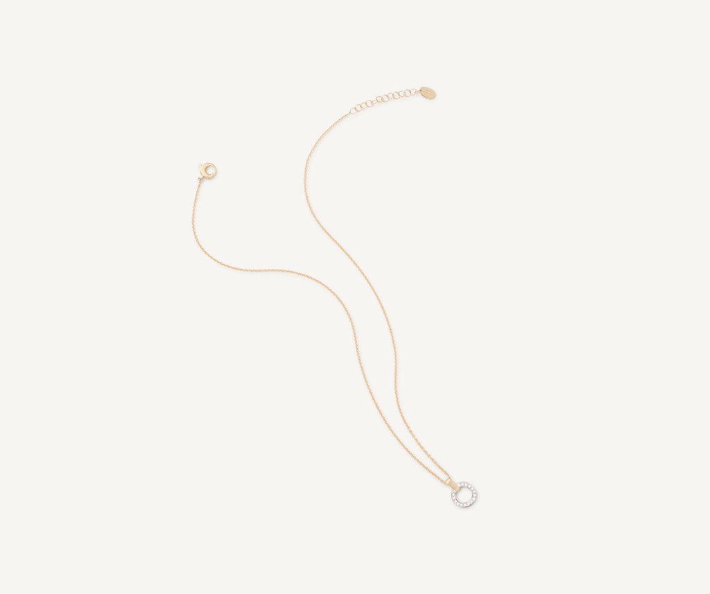 Eine raffinierte Halskette, die mit einem diamantbesetzten runden Anhänger aus Weißgold mit 18 Karat veredelt ist. Das Gold ist in einer antiken Technik mit dem Fadenstichel von Hand graviert, um eine zarte, unregelmäßige Satinierung zu erzielen.