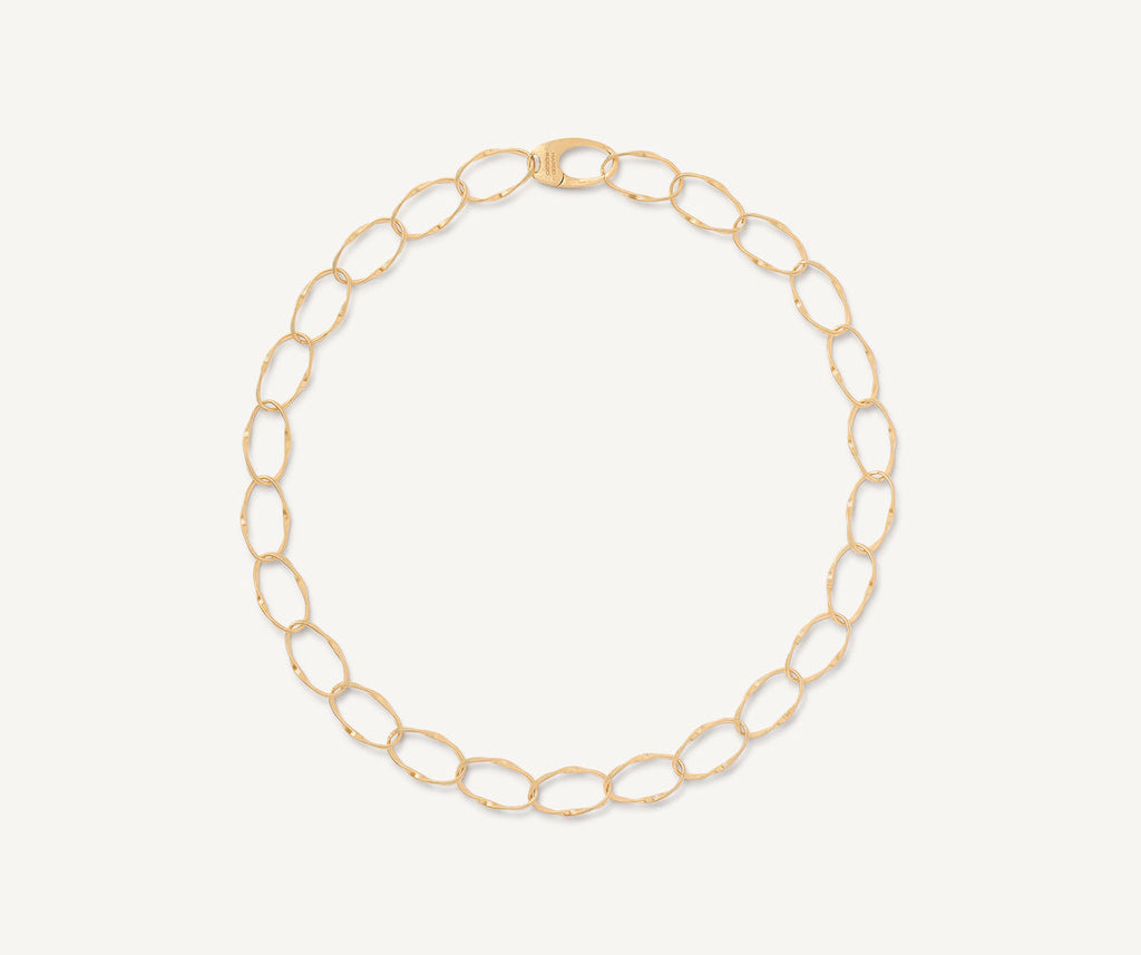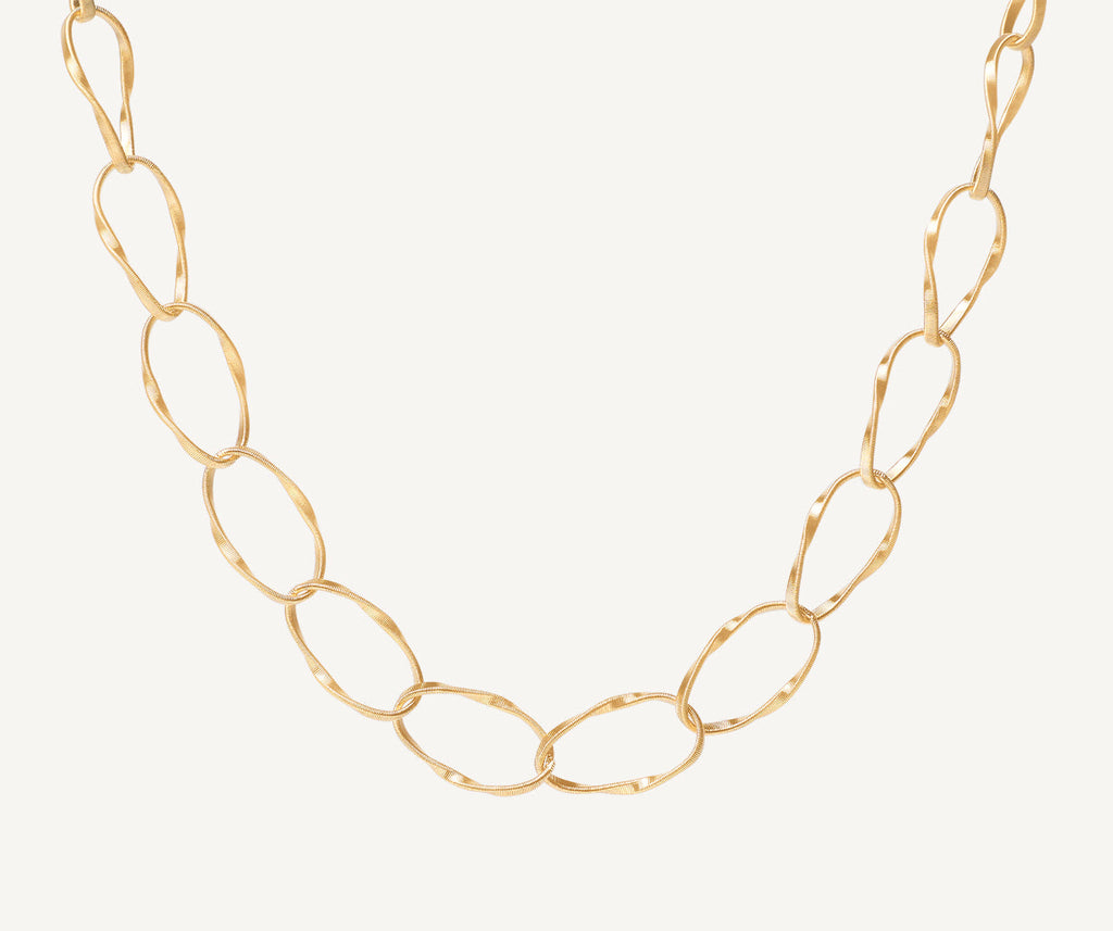Diese leichte Kette reiht Ovale aus gedrehter Spirale aneinander, die mit der exklusiven handwerklichen Coil-Technik gefertigt ist. Diese elegante und schlichte Halskette aus Gelbgold mit 18 Karat besticht mit ihrem edlen Design.