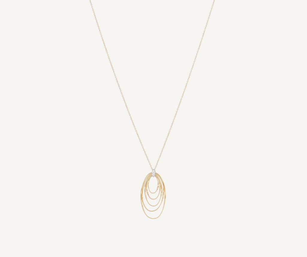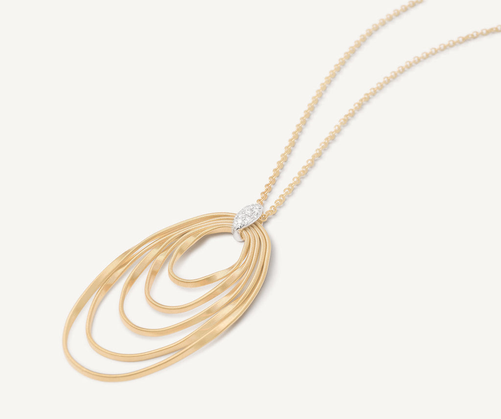 Romantischer Anhänger aus Gelbgold mit 18 Karat mit langer Kette. Die fünf Elemente aus gedrehter Spirale sind mit der exklusiven handwerklichen Coil-Technik gefertigt und durch eine elegante Öse mit Diamantpavé in Brillantschliff miteinander verbunden. Ein elegantes und edles Schmuckstück.