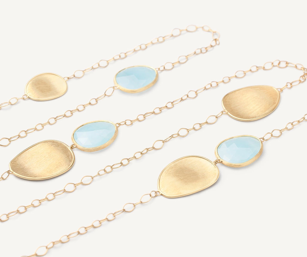 Die Natur war Inspiration für diese lange Halskette. Leichte Blätter in Gelbgold mit 18 Karat, das in einer antiken Technik mit dem Fadenstichel von Hand graviert ist, um eine zarte, unregelmäßige Satinierung zu erzielen, reihen sich aneinander und werden in Intervallen durch eine feine Kette unterbrochen. Die Komposition wird mit Blättern aus Milky-Aquamarin veredelt, die mit zarten Hellblau-Nuancen einen farbigen Touch ins Spiel bringen.