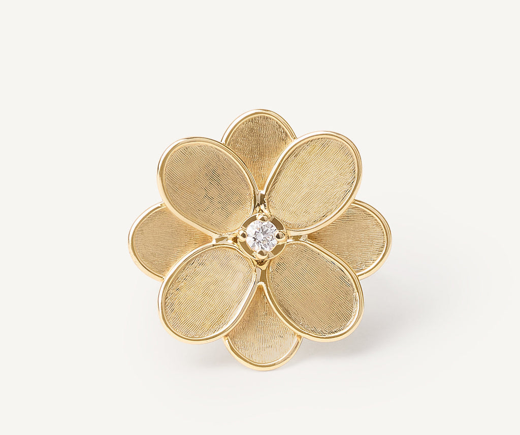 Blütenblätter aus Gelbgold mit 18 Karat, die in einer antiken Technik mit dem Fadenstichel von Hand graviert sind, um eine zarte, unregelmäßige Satinierung zu erzielen, umgeben einen wertvollen Diamanten in Brillantschliff. Dieser romantische Ring, dessen Design von Blumenkompositionen inspiriert ist, ist ein echtes Must-have.