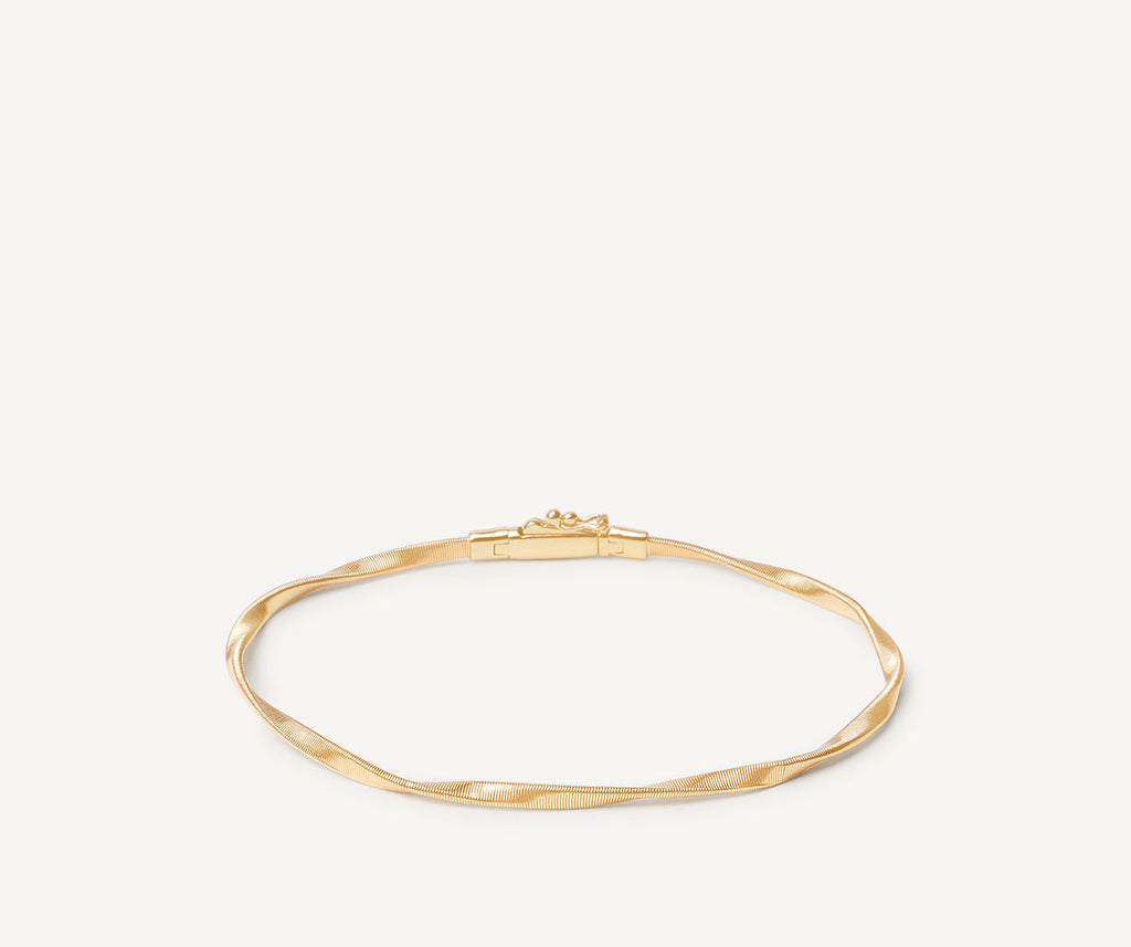 Esta elegante pulsera, en oro amarillo de 18 kt, está realizada con un aro retorcido, un efecto conseguido mediante la exclusiva técnica orfebre artesanal en espiral. Es perfecta para llevarla por sí sola o para combinarla con otras pulseras de la colección. Sublime por su elegancia y sencillez.