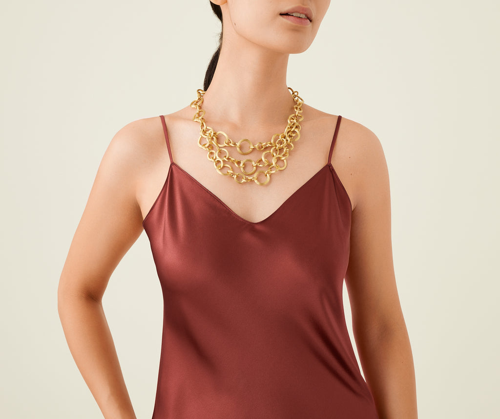 Este collar es una maravillosa interpretación de la clásica cadena, con una secuencia de elementos circulares de oro amarillo de 18 kt, conectados entre sí y grabados finamente a mano mediante la antigua técnica orfebre artesanal del buril mil rayas. Los dos cierres, cuidadosamente posicionados, permiten poder usarlo como pulsera y llevarlo puesto de diferentes maneras.