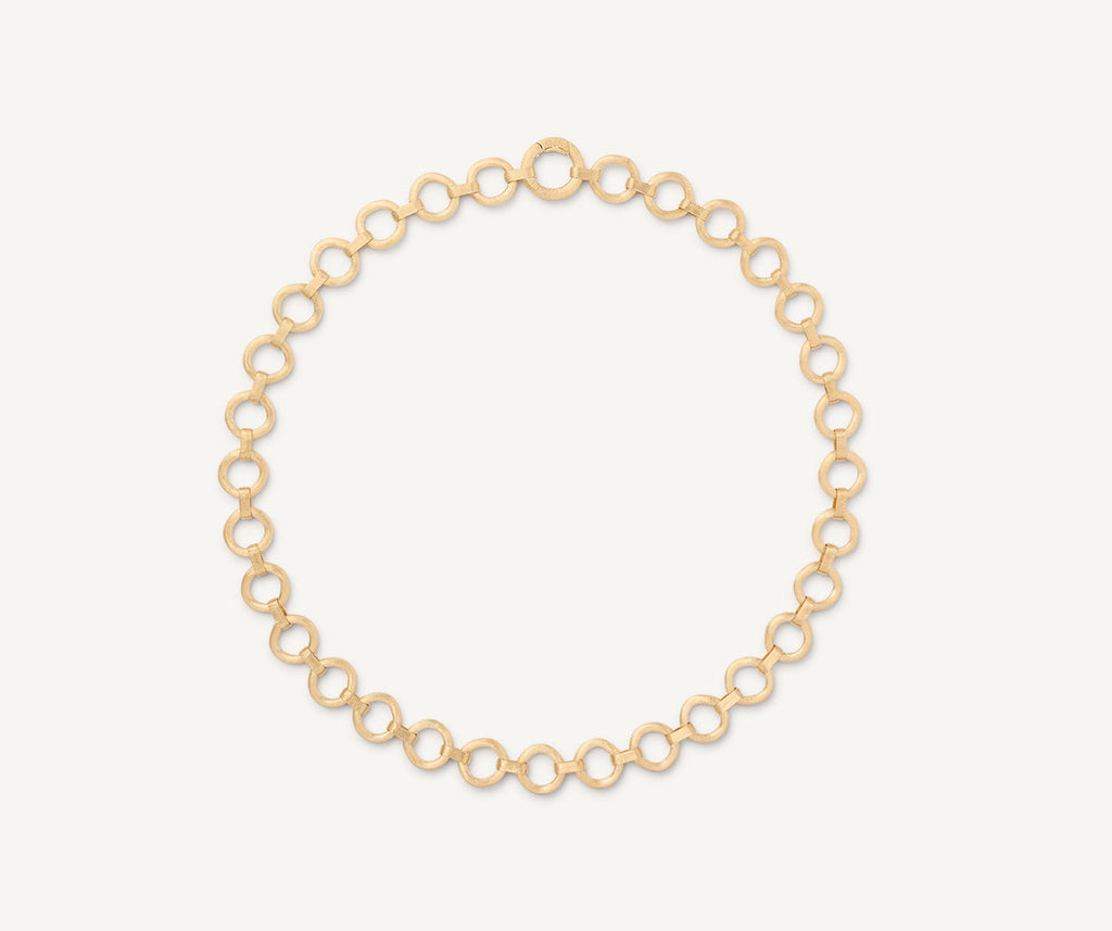 Este collar está compuesto por detalles decorativos en forma circular de oro amarillo de 18 kt, grabados finamente a mano mediante la antigua técnica orfebre artesanal del buril mil rayas; una joya pensada como la base ideal para combinar con otros colgantes de la colección.