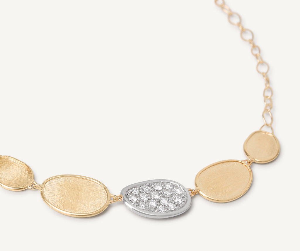 Una hoja de pavé de diamantes en talla brillante resplandece en el centro de esta elegante gargantilla con efecto degradado y formas irregulares. Los elementos en oro amarillo de 18 kt se han grabado finamente a mano mediante la antigua técnica orfebre artesanal del buril mil rayas para un efecto brillante extraordinario y un tacto sedoso.