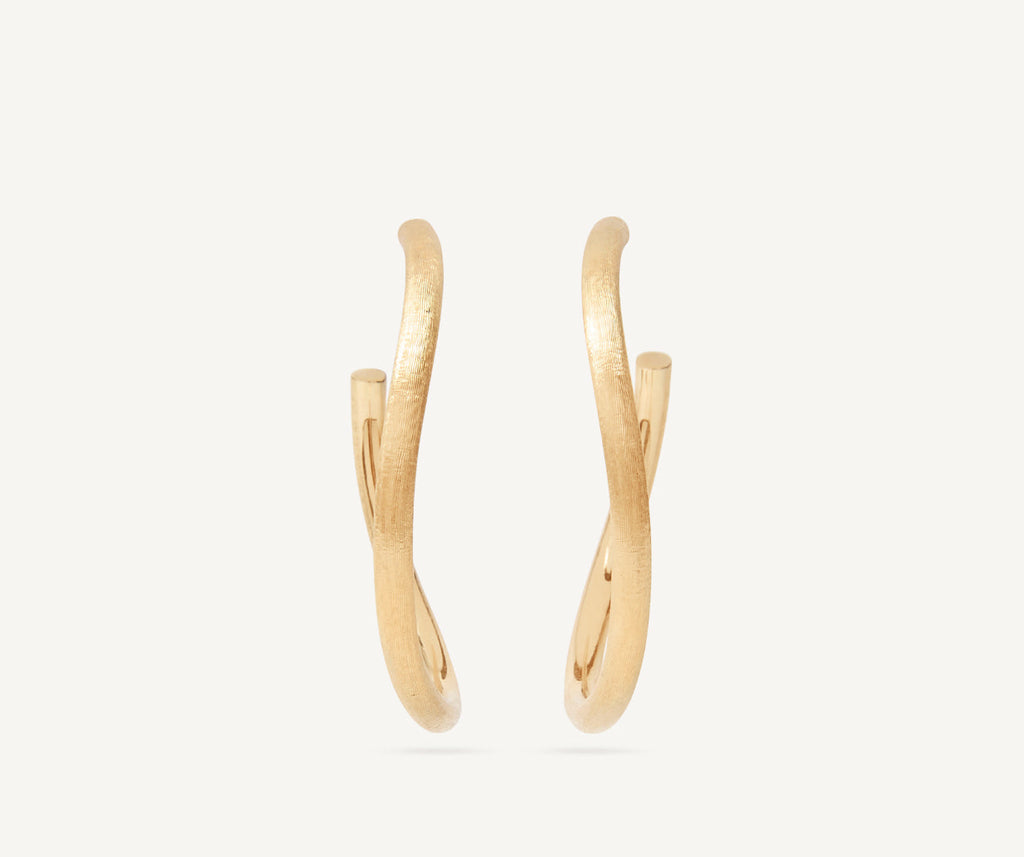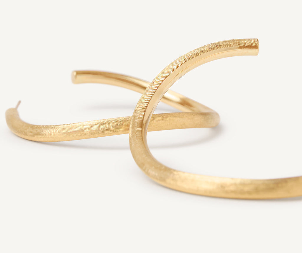 Esta joya es ideal para un estilo atrevido y desenfadado. Estos pendientes de aro en oro amarillo de 18 kt están grabados finamente a mano mediante la antigua técnica orfebre artesanal del buril mil rayas y quedan bien con cualquier conjunto.