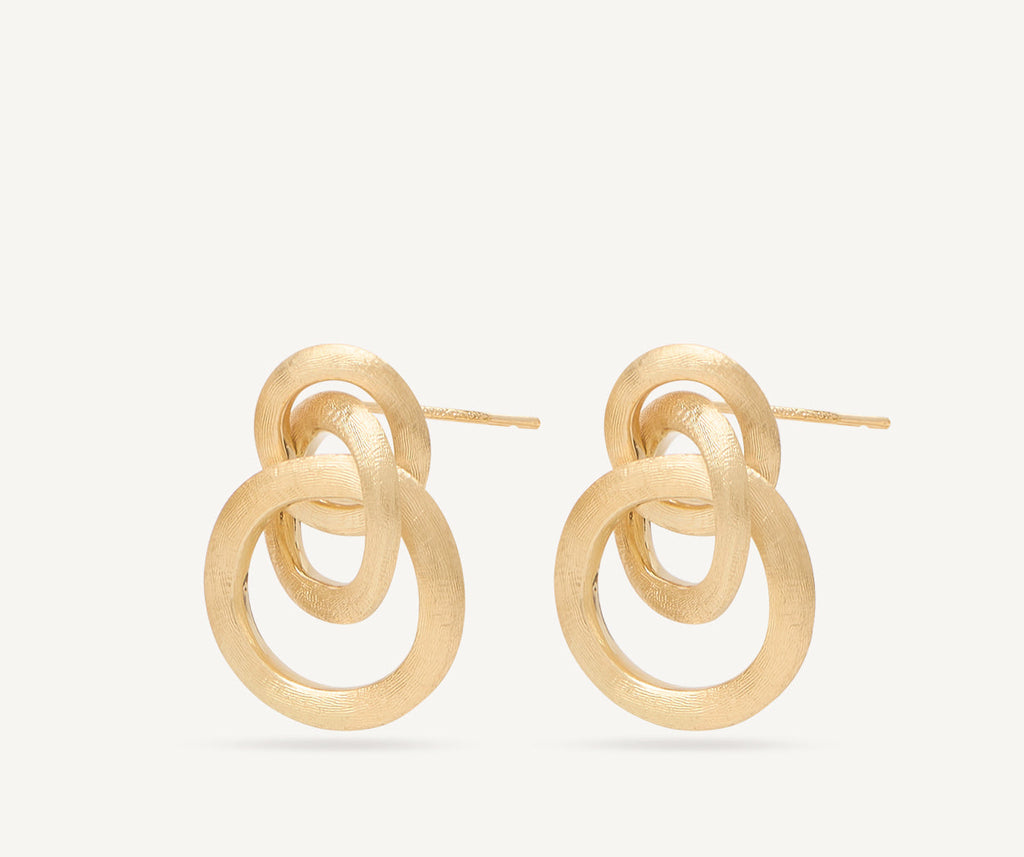Este modelo presenta tres elementos enlazados entre sí mediante un elegante entrelazado irregular. Realizado en oro amarillo de 18 kt, está grabado finamente a mano mediante la antigua técnica orfebre artesanal del buril mil rayas.