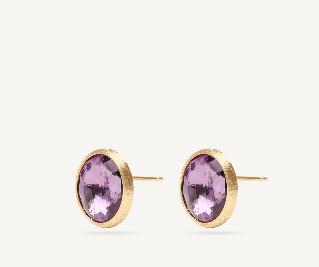 Presentamos la versión grande del icónico pendiente de botón de la colección Jaipur. Este modelo de pendiente se caracteriza por dos amatistas claras, seleccionadas meticulosamente.