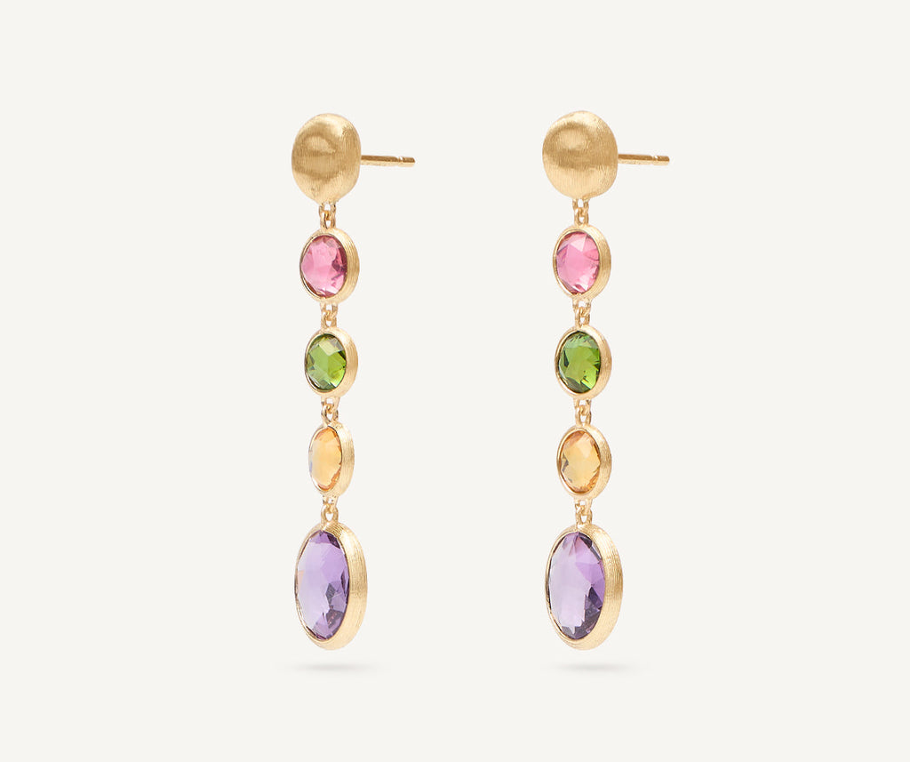 Este pendiente refleja el gusto del diseñador por las originales combinaciones cromáticas, con una selección de piedras preciosas de distintos colores, seleccionadas cuidadosamente por su pureza e intensidad, y decoradas con una virola de oro amarillo de 18 kt, grabada finamente a mano mediante la antigua técnica orfebre artesanal del buril mil rayas.