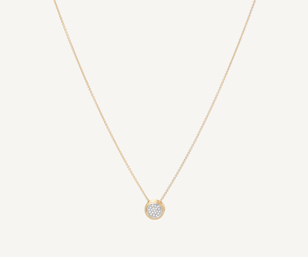Este delicado colgante de oro amarillo de 18 kt, grabado finamente a mano mediante la antigua técnica orfebre artesanal del buril mil rayas, está decorado con una moneda en pavé de diamantes en talla brillante. Con la cadena regulable es más versátil y es perfecto para cualquier ocasión.
