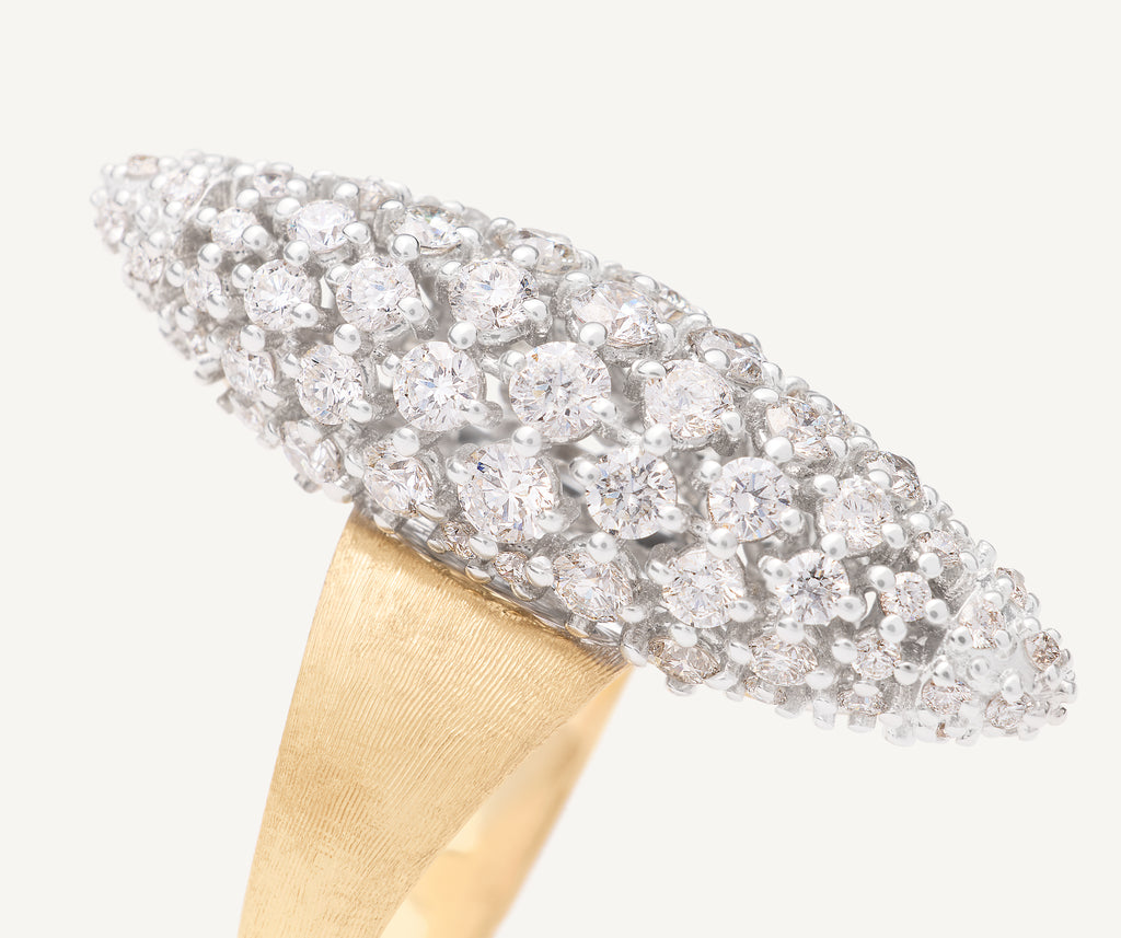 Con sus volúmenes esculturales, este anillo de oro amarillo de 18 quilates está adornado con un elemento central de forma ovalada en pavé de diamantes. El aro está grabado finamente a mano mediante la antigua técnica orfebre artesanal del buril mil rayas, para un efecto brillante extraordinario y un tacto sedoso.