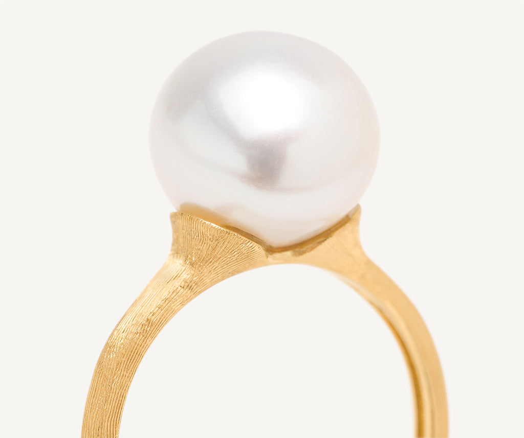 Este anillo, en oro amarillo de 18 kt y grabado finamente a mano mediante la antigua técnica del buril mil rayas, está decorado con una perla de agua dulce blanca, la cual ha sido cuidadosamente seleccionada. Elegante y con una belleza imperecedera, se trata de un clásico reinterpretado en clave actual.