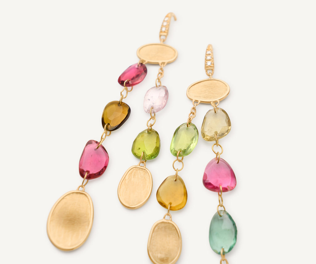 These 18K yellow gold multi-strand earrings feature a stunning array of tourmalines, complemented by a delicate diamond pavé hook. Perfect for any occasion, they add a vibrant touch of elegance to any ensemble.