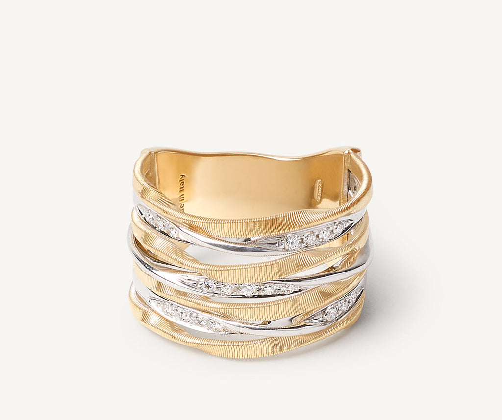 Un anillo en oro amarillo de 18 kt, con un estilo refinado que es perfecto para poder llevar todos los días. Se compone de siete aros retorcidos, un efecto conseguido mediante la exclusiva técnica orfebre artesanal en espiral, que se alternan con pavé de diamantes en talla brillante para una secuencia elegante de colores y texturas.
