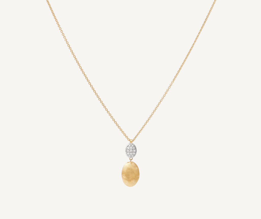 Este elegante collar en oro amarillo de 18 kt y con cadena regulable presenta un colgante doble con óvalos pequeños de superficie irregular, la cual se ha grabado a mano mediante la antigua técnica orfebre artesanal del buril mil rayas, y está decorado con un pavé de diamantes en talla brillante.