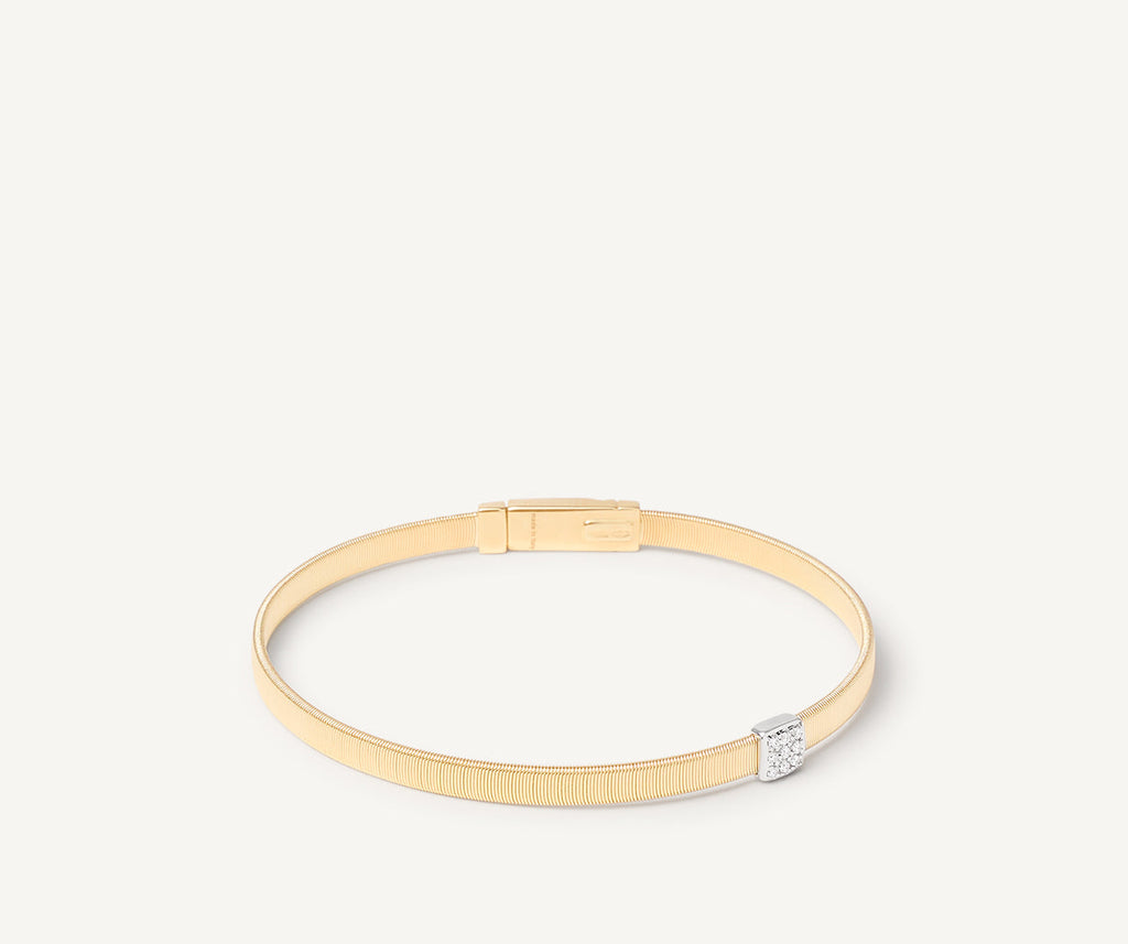 Sobre et épuré, ce bracelet en or jaune 18 carats arbore un volume unique. Un rang de spirale plate, réalisée selon un savoir-faire exclusif appelé «coil», est rehaussé d’un pavé de diamants taille brillant. Élégant seul, il est également parfait associé aux autres bijoux Marco Bicego.