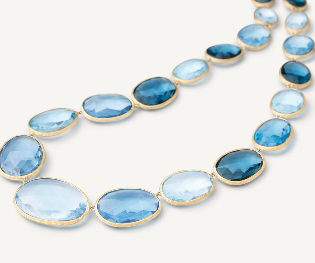 Véritable hommage à la beauté de la nature et à ses joyaux, cet élégant collier est un superbe dégradé de topazes bleues délicatement serties dans une monture en or jaune 18 carats, gravée à la main selon une ancienne technique florentine. Ce bijou raffiné est un hymne à la féminité et se porte avec élégance sans le moindre effort.