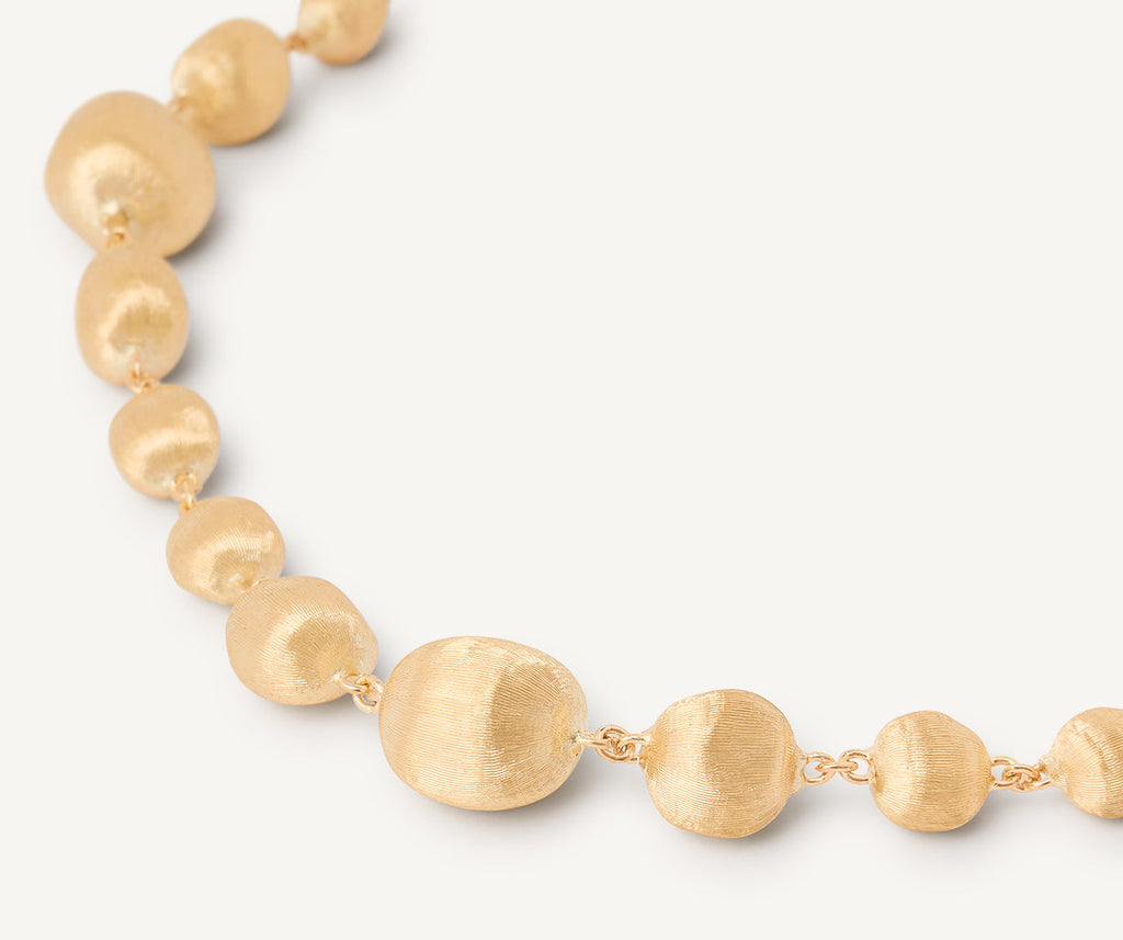 Ce bracelet sophistiqué est caractérisé par une succession de billes en or jaune 18 carats de différentes dimensions. Il arbore une surface irrégulière, finement gravée à la main selon une ancienne technique florentine, pour un éclat incomparable et un toucher soyeux.