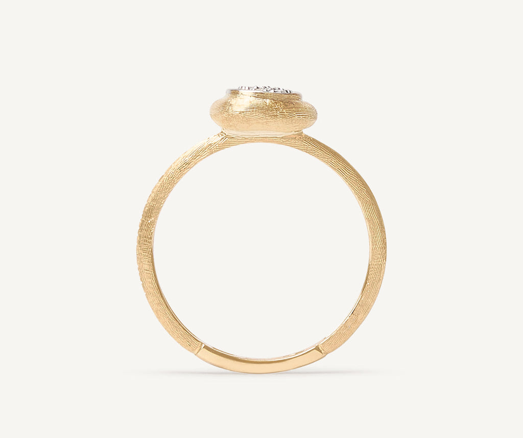 Cette élégante bague monte une pièce pavée de diamants taille brillant. L’or jaune 18 carats est finement gravé à la main selon une ancienne technique florentine.