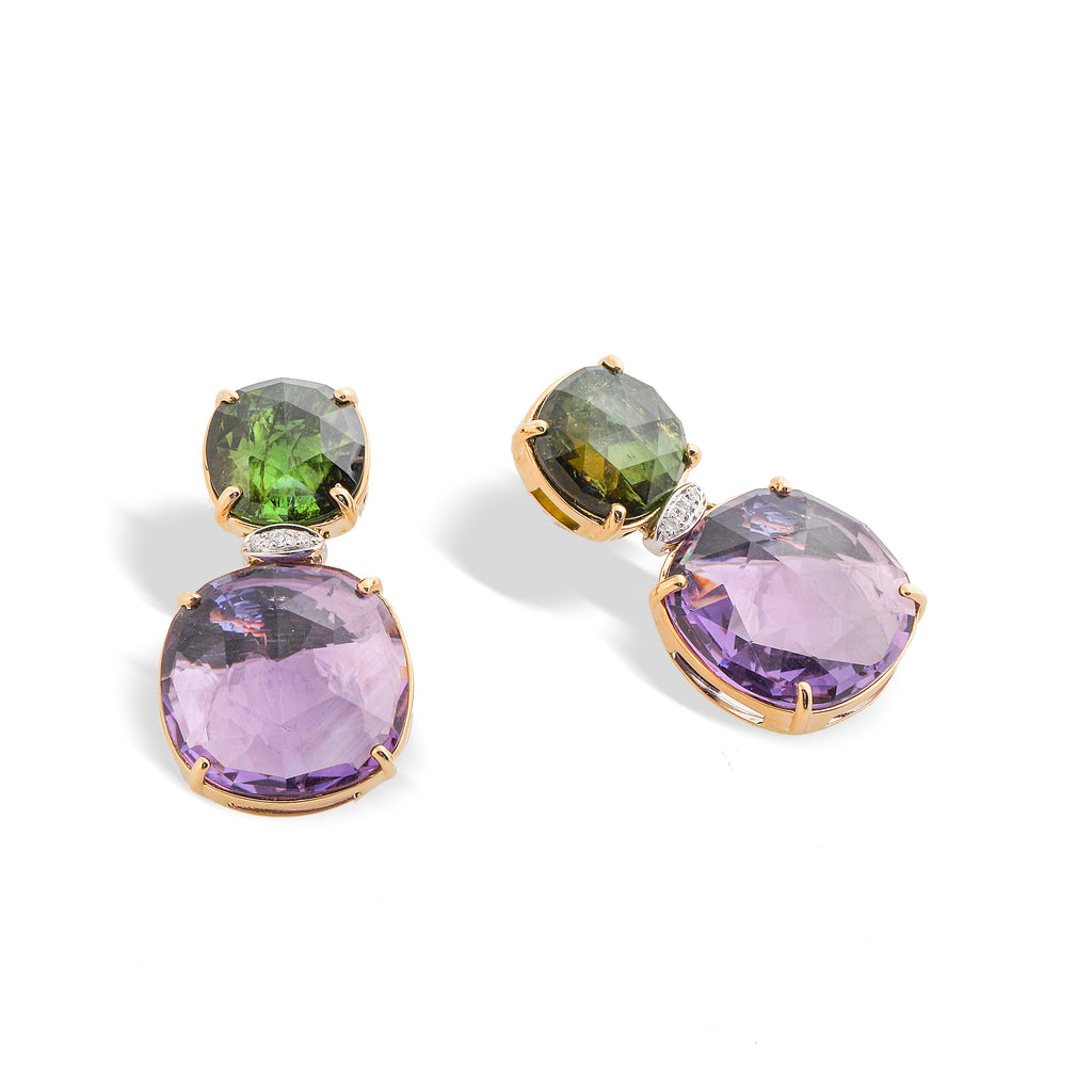 Orecchini pendenti con tormalina verde, ametista e pavé di diamanti
