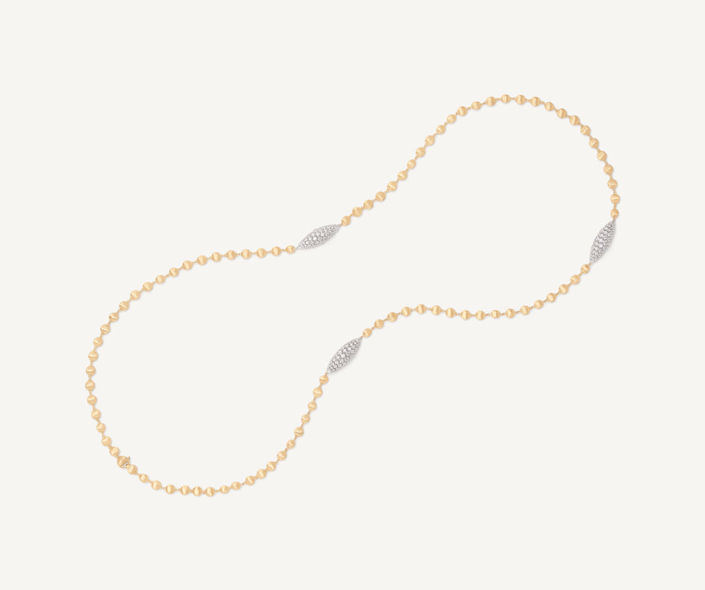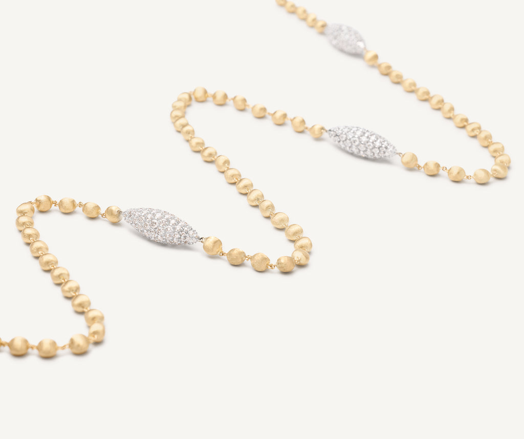 Collana lunga in oro giallo con sfere ed elementi in pavé di diamanti