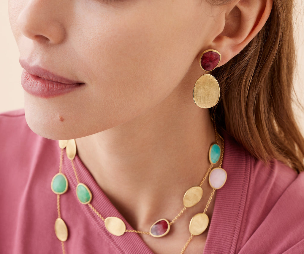 Questi orecchini pendenti dal design a doppia goccia sono perfetti per un’eleganza discreta ma d’impatto. Le foglie in oro giallo 18 carati, finemente incise a mano con l'antica tecnica del bulino millerighe, sono impreziosite da due pietre sfaccettate di tulite rossa. Ideali per aggiungere un tocco di colore a qualsiasi look.