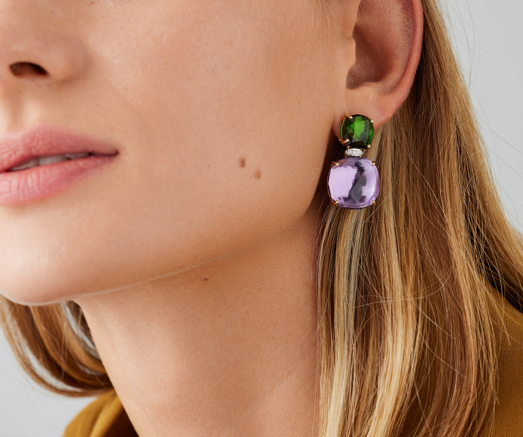 18kt Yellow Gold Drop Earrings with Pink Tourmaline, Amethyst, and Diamond Pavé